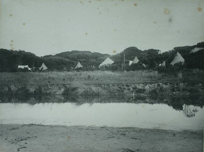 View of the campsite set up by the Field Naturalists Club of Victoria at Yellow Rock Beach, King Island during a scientific expedition to the island in November 1887. In the foreground is the Yellow Rock rivulet.