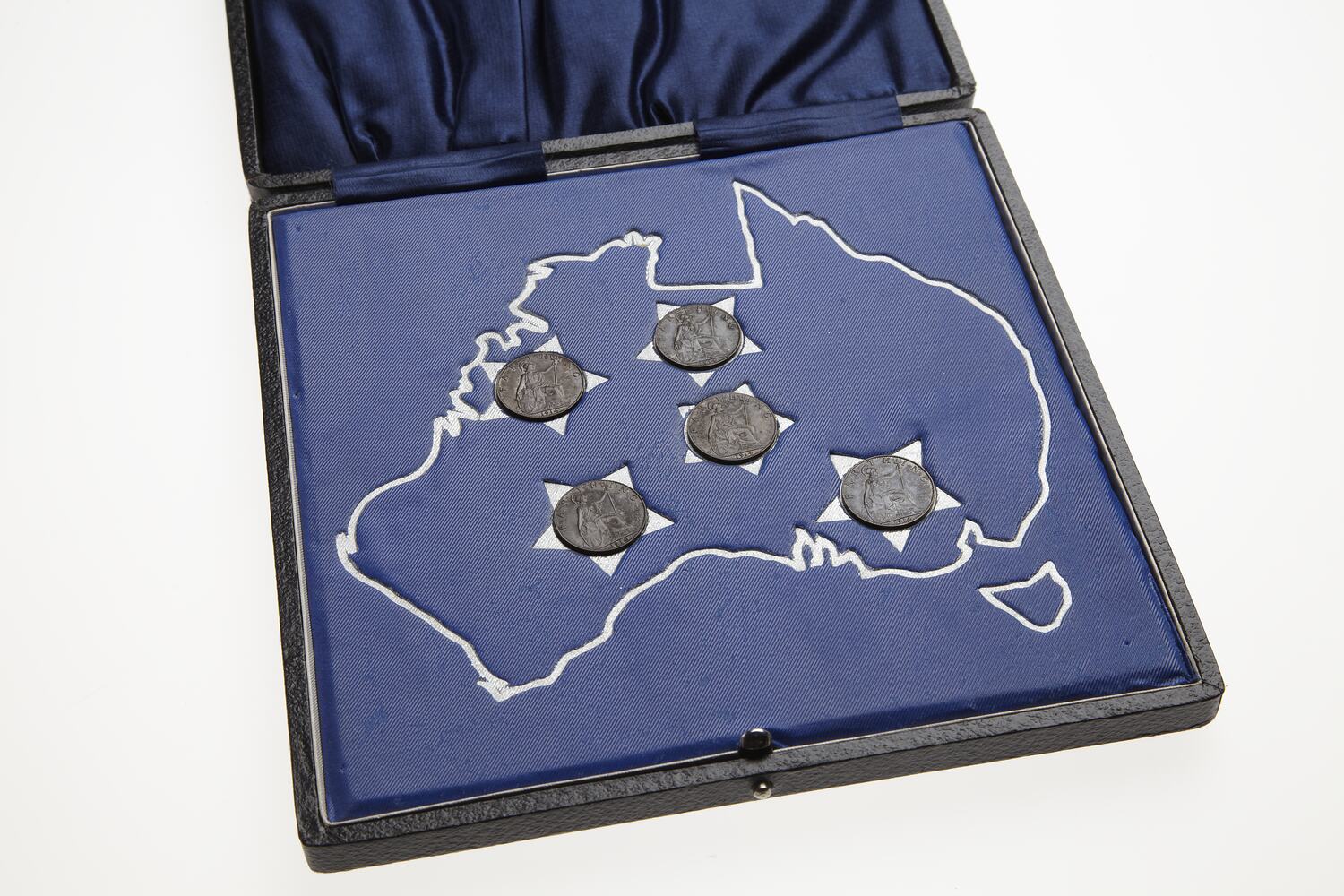Square hinged box inscribed on lid 'Anzac Commemoration 1926' containing an outline of Australia into which is set five 1914 farthings. Mid-blue ground; white star shape around each farthing. Dark blue gathered satin lining to box.