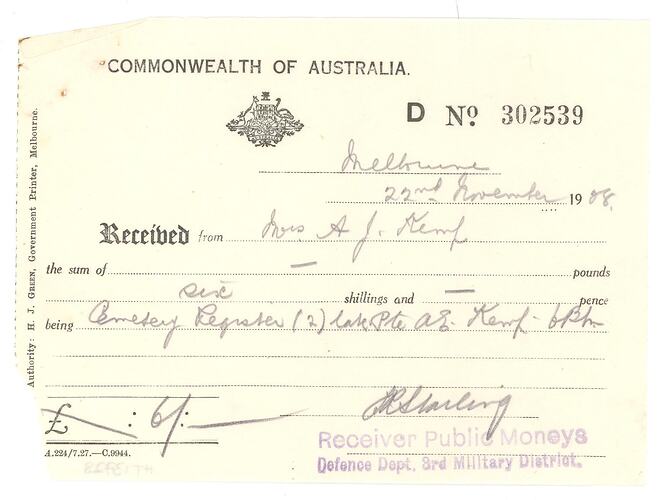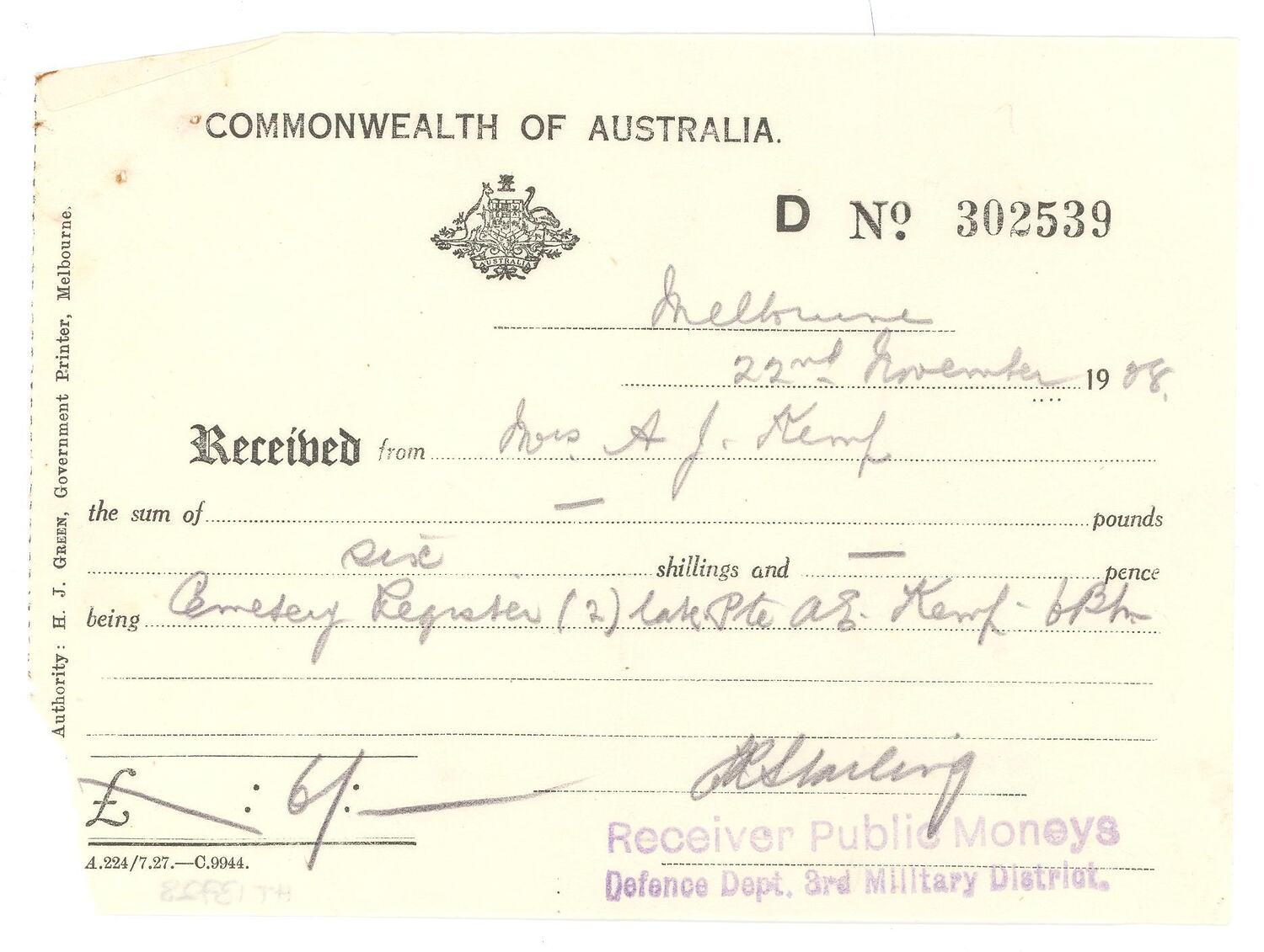 Receipt for 'Cemetry Register (2)' issued to Annie Josephine Kemp, widow of Private Albert Edward Kemp, who was killed in action in 1917, during World War I. Dated 1928, the receipt is for £6, and was stamped by the Receiver of Public Monies, Defence Department, 3rd Military District.