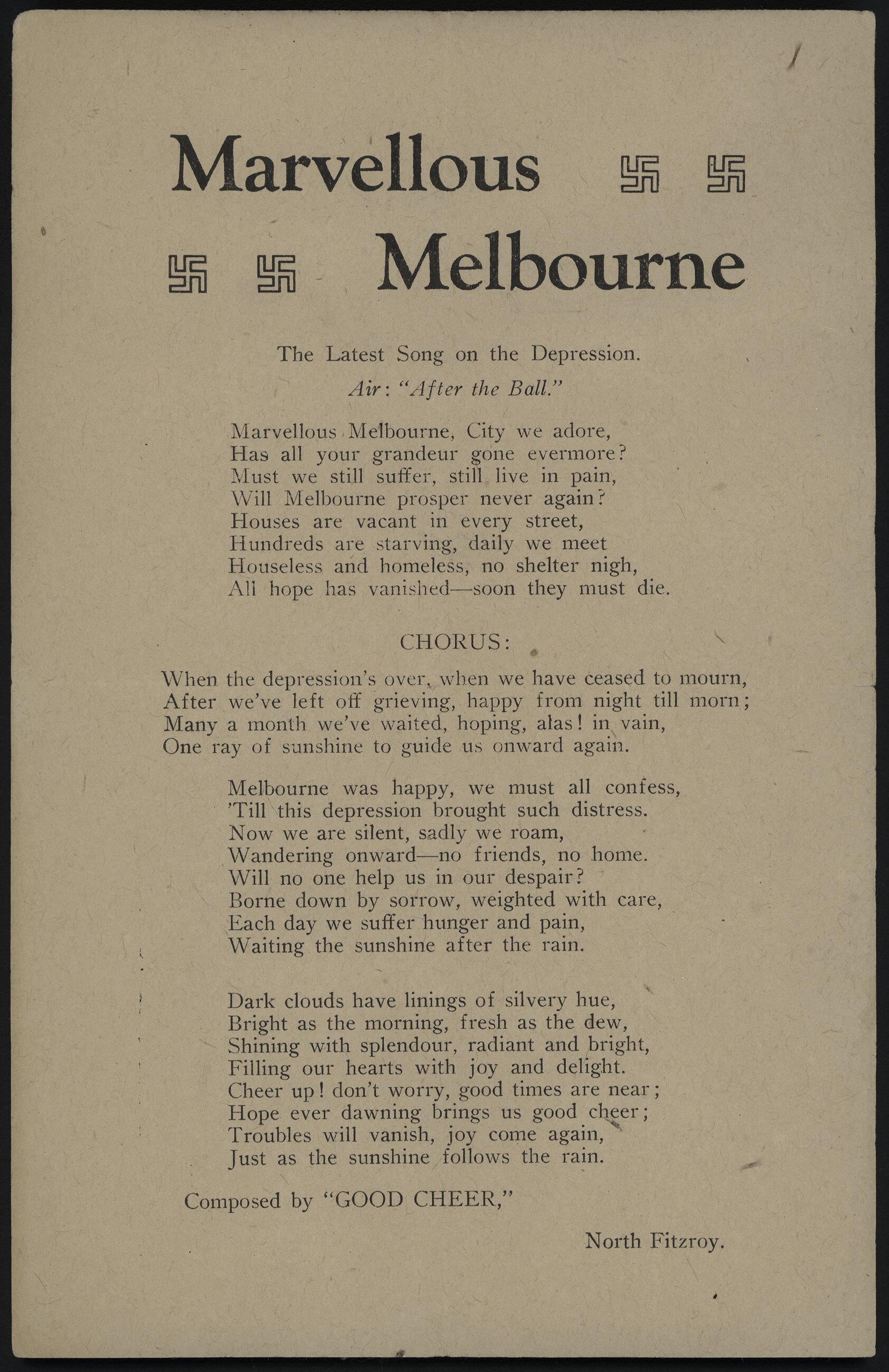 This street ballad is a rare surviving example of a highly ephemeral material which was sold by street balladeers in Melbourne the late 19th and early 20th century. They were often highly political in nature, and usually dealt with contemporary events, such as disasters, labour disputes and strikes, political and sporting figures, as well as economical downturns, such as those which occurred during the 1890s and 1930s. This is an important piece of popular culture related to the 1890s Depression, which ironically uses the title `Marvellous Melbourne', a moniker that was originally linked to the period of great economic growth during the 1870s and 1880s.