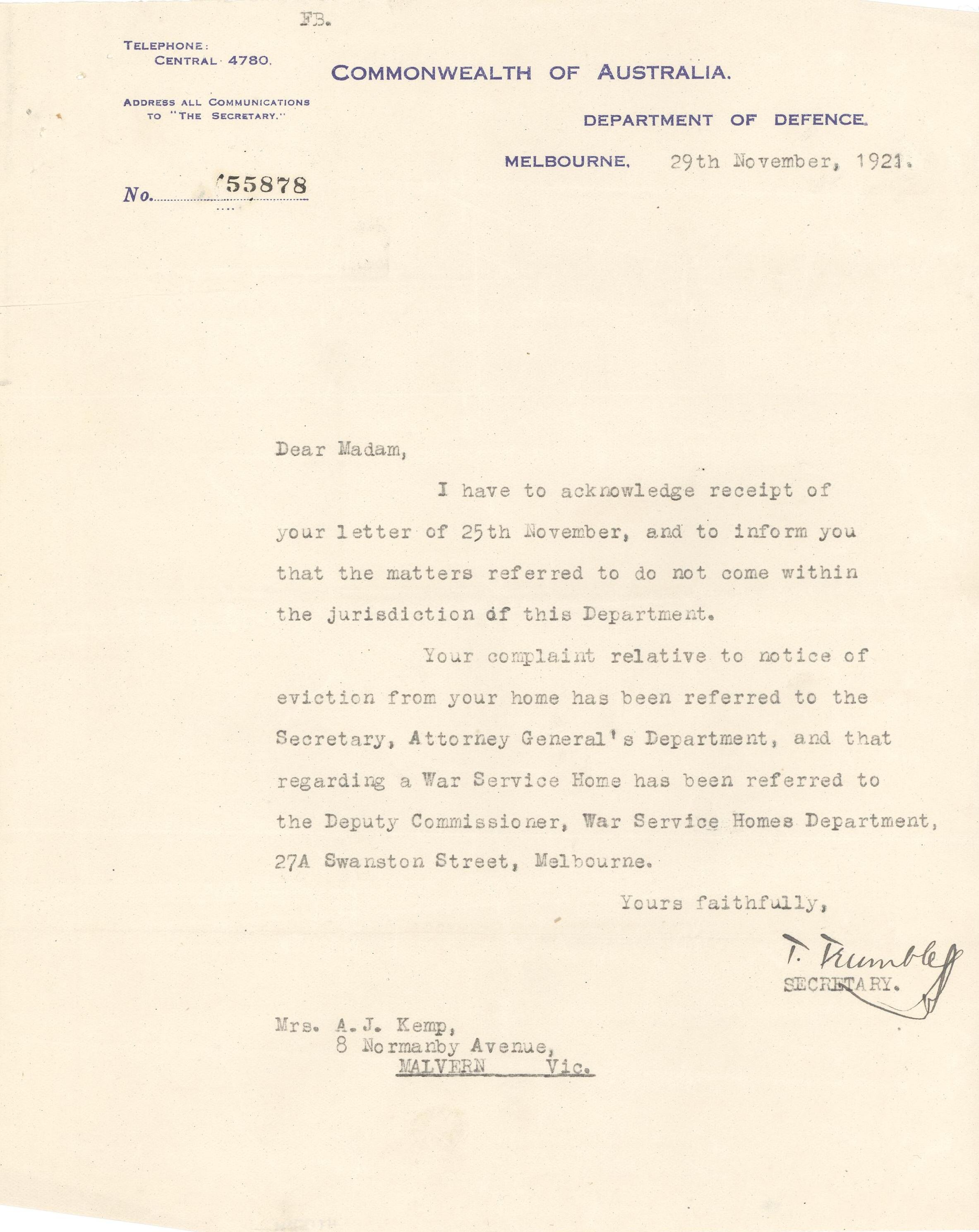 Text: COMMONWEALTH OF AUSTRALIA/DEPARTMENT OF DEFENCE/MELBOURNE 29th November, 1921/Dear Madam/I have to acknowledge receipt of/your letter of 25th November, and to inform you/that the matters referred to do not come within/the jurisdiction of this Department/Your complaint relative to notice of/eviction from your home has been referred to the/Secretary, Attorney General's Department, and that/regarding a War SErvices Home has been referred to/the Deputy Commissioner, War SErvices Homes Department.27A Swanston Street, Melbourne.