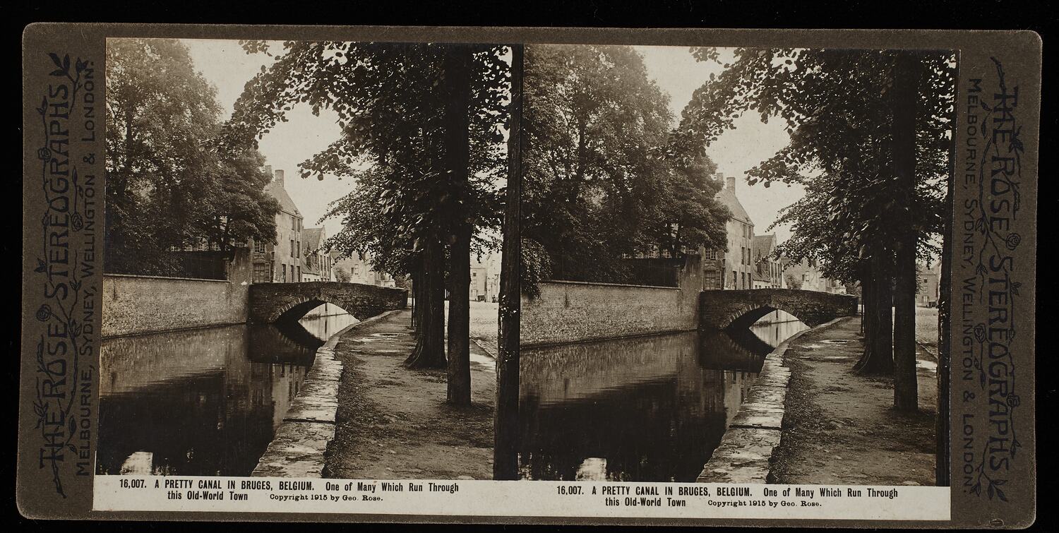 Rose stereograph titled "A Pretty Canal in Bruges, Belgium. One of Many Which Run Through this Old-World Town". Copyright 1915 by Geo. Rose. One in a series of 32 stereographs dating from the early 20th century.