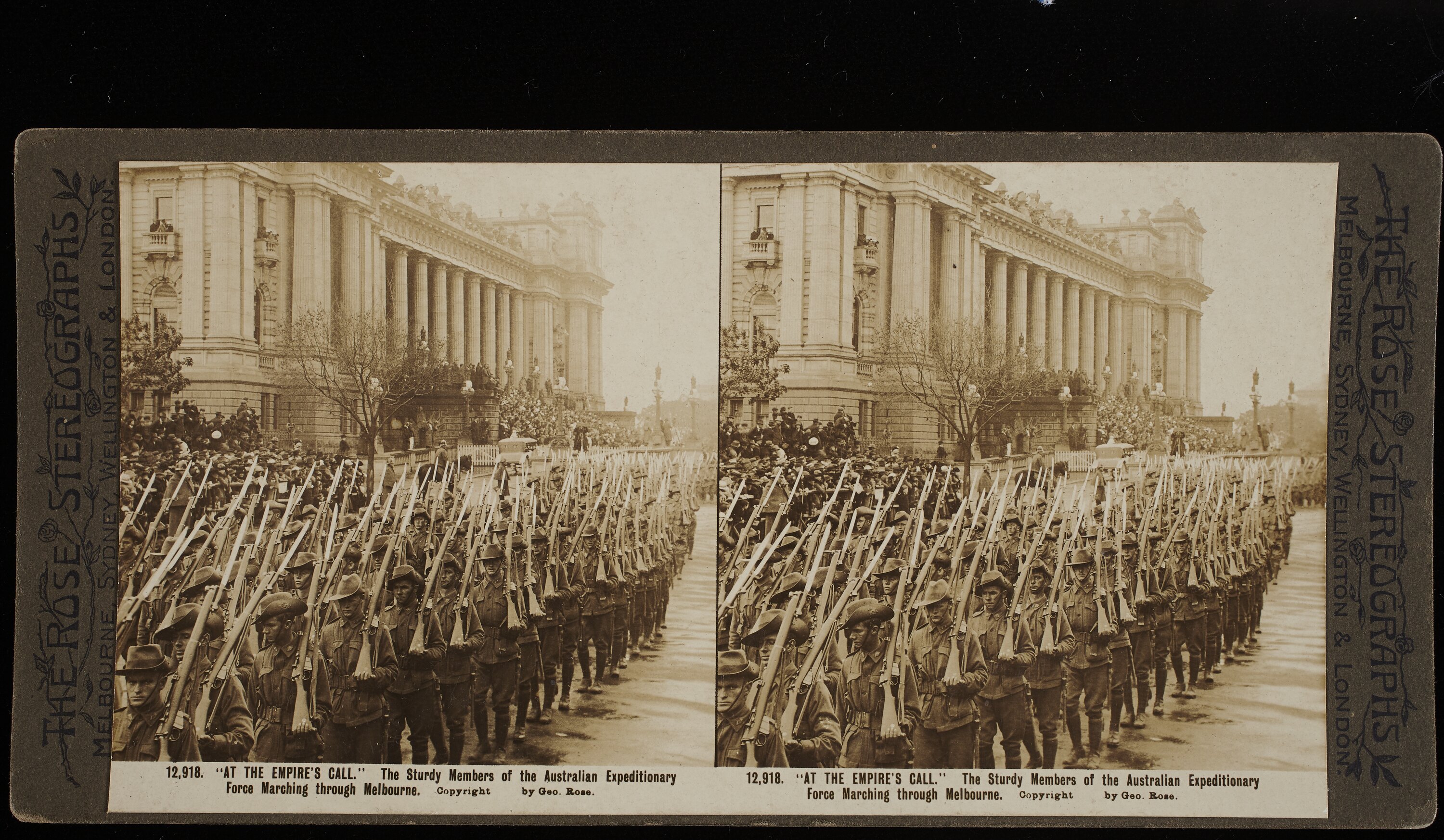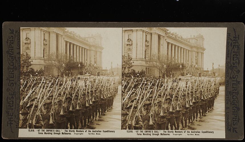 Rose stereograph titled "At The Empire's Call - The Sturdy Members of the Australian Expeditionary Force Marching Through Melbourne". World War I. Copyright by Geo. Rose. One in a series of 32 stereographs dating from the early 20th century.