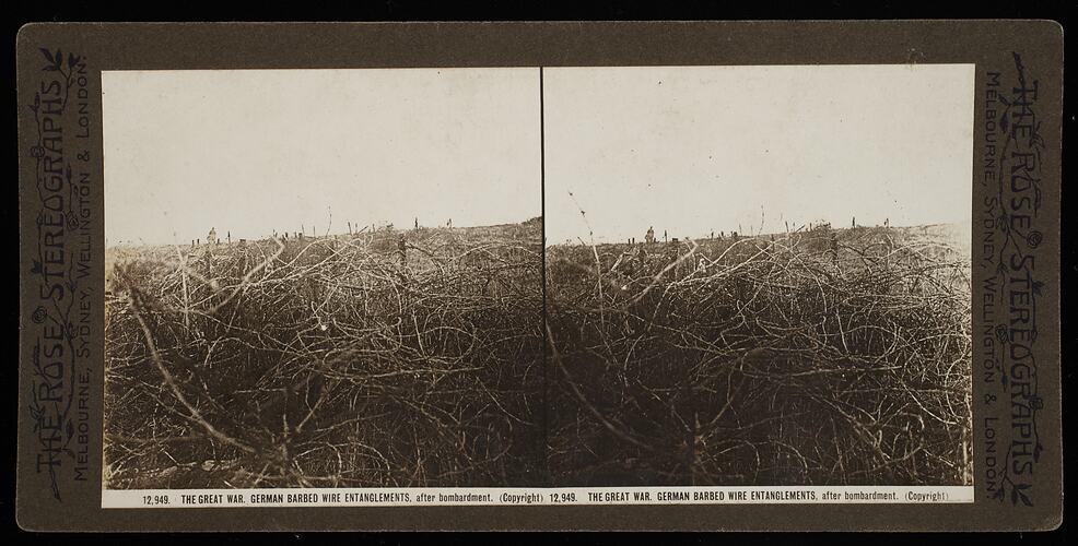 Rose stereograph titled "The Great War. German Barbed Wire Entanglements, after bombardment". World War I. One in a series of 32 stereographs dating from the early 20th century.