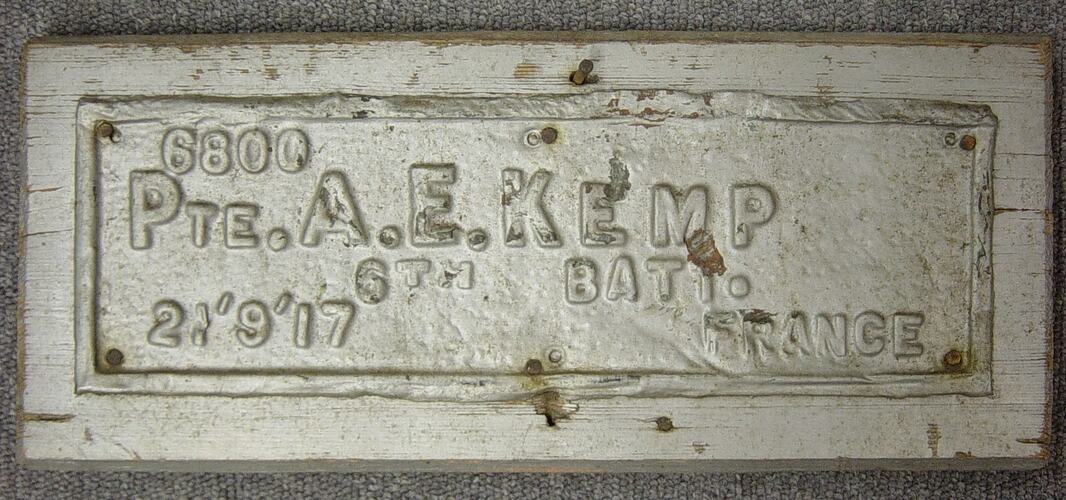Pressed steel name plaque on board. Inscribed "6800 / PTE. A. E. KEMP / 6th BATT. / 21'9'17 / FRANCE"