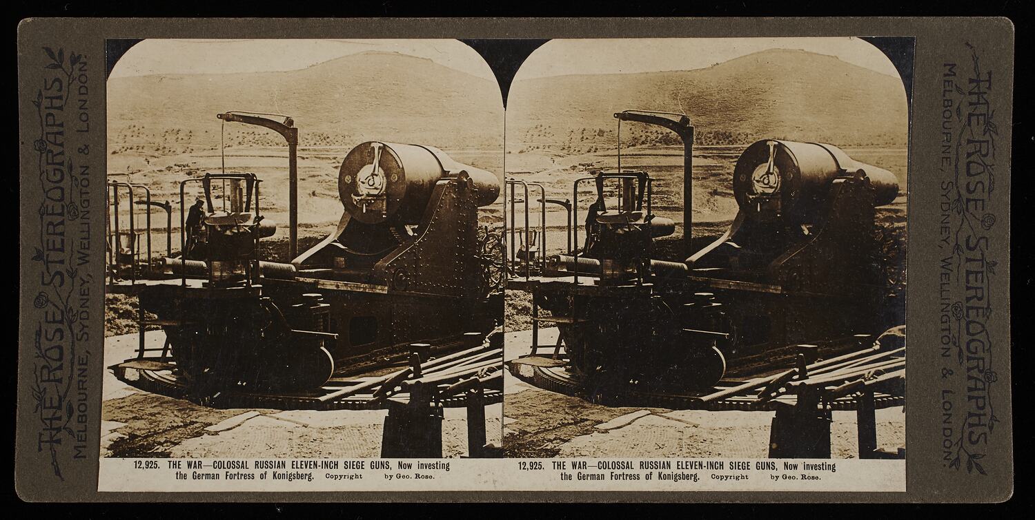 Rose stereograph titled "The War - Colossal Russian Eleven-Inch Siege Guns, Now investing the German Fortress of Konigsberg". Copyright by Geo. Rose. World War I. One in a series of 32 stereographs dating from the early 20th century.
