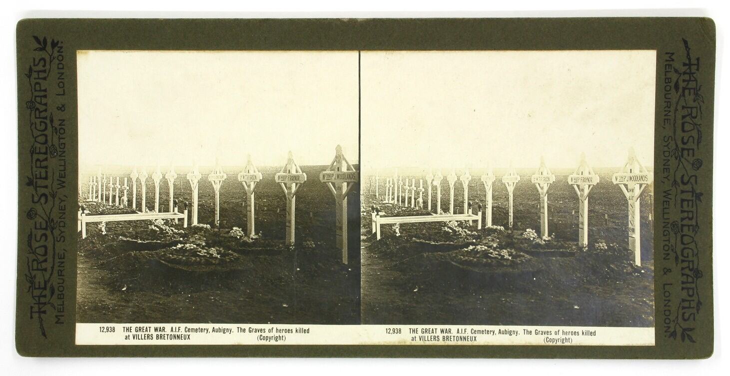 Rose stereograph titled "The Great War - AIF Cemetery, Aubigny. The Graves of heroes killed at Villers Bretonneux". World War I. One in a series of 32 stereographs dating from the early 20th century.