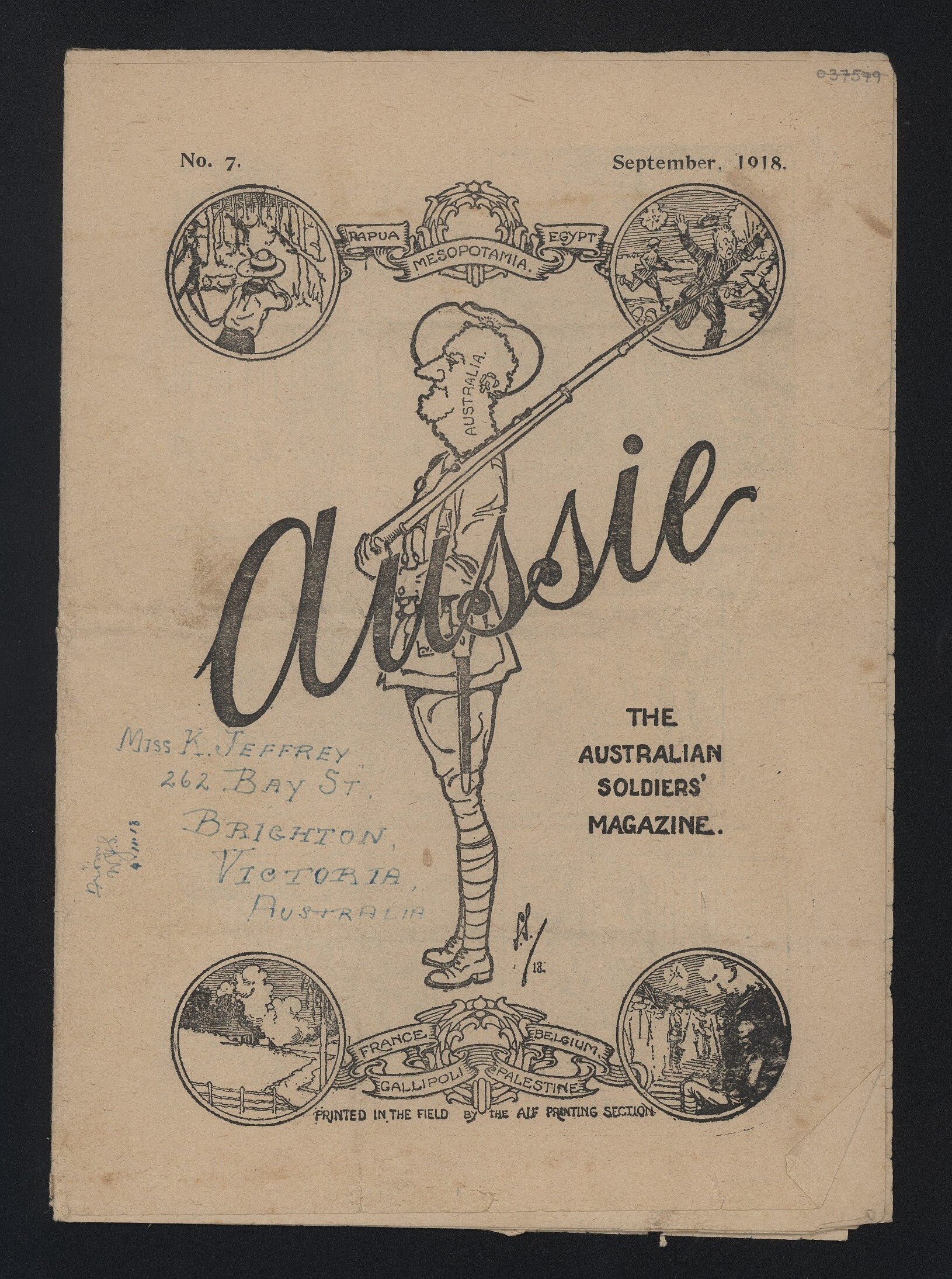 Printed on cover: 'No. 7 / September 1918 / Aussie / PAPUA EGYPT MESOPOTAMIA /THE / AUSTRALIAN / SOLDIERS / MAGAZINE. / FRANCE BELGIUM / GALLIPOLI PALESTINE / PRINTED IN THE FIELD BY THE AIF PRINTING SECTION'. Handwritten inscription in blue ink at centre left reads 'MISS K. JEFFREY / 262 BAY ST / BRIGHTON / VICTORIA / AUSTRALIA'.