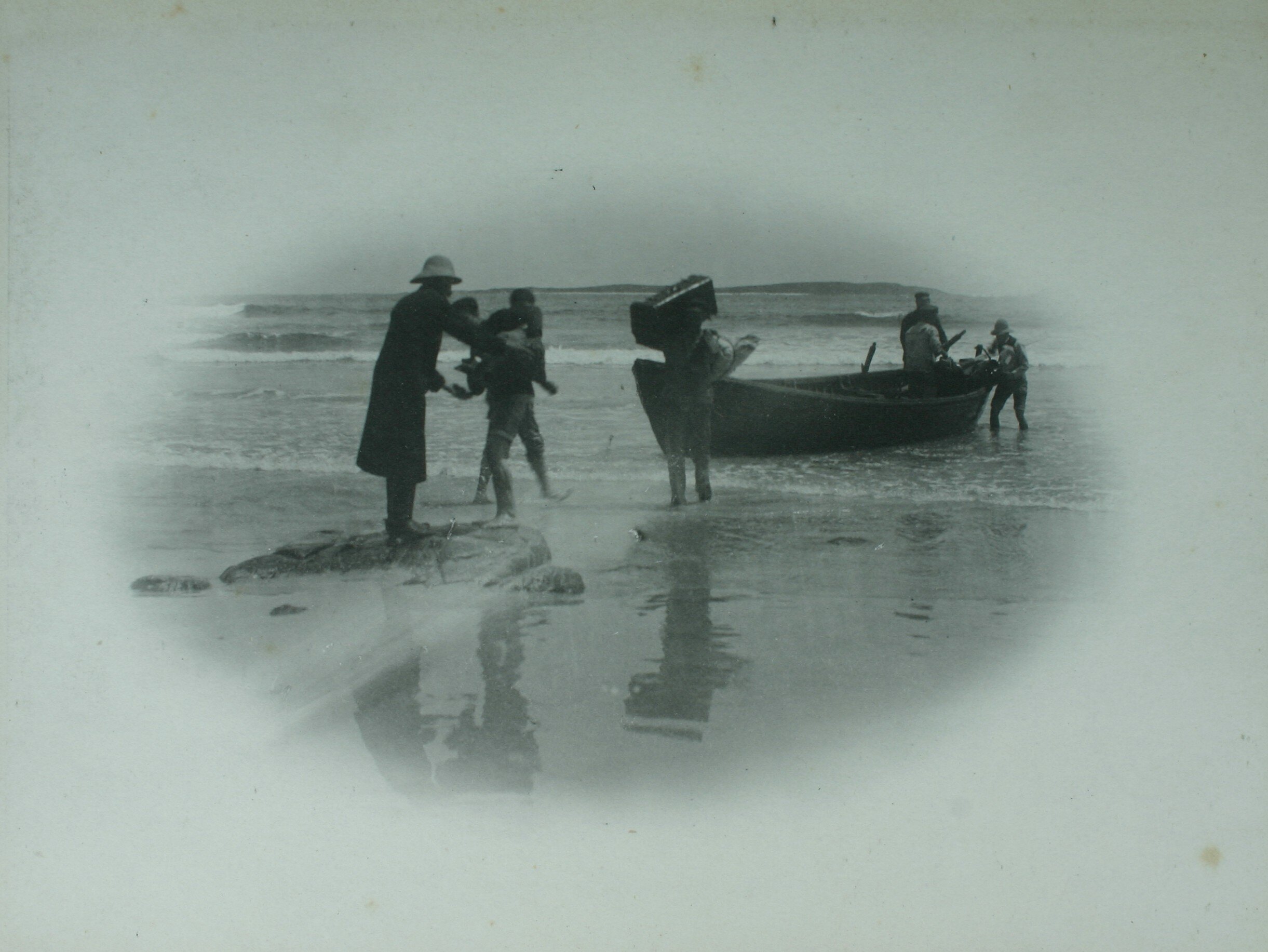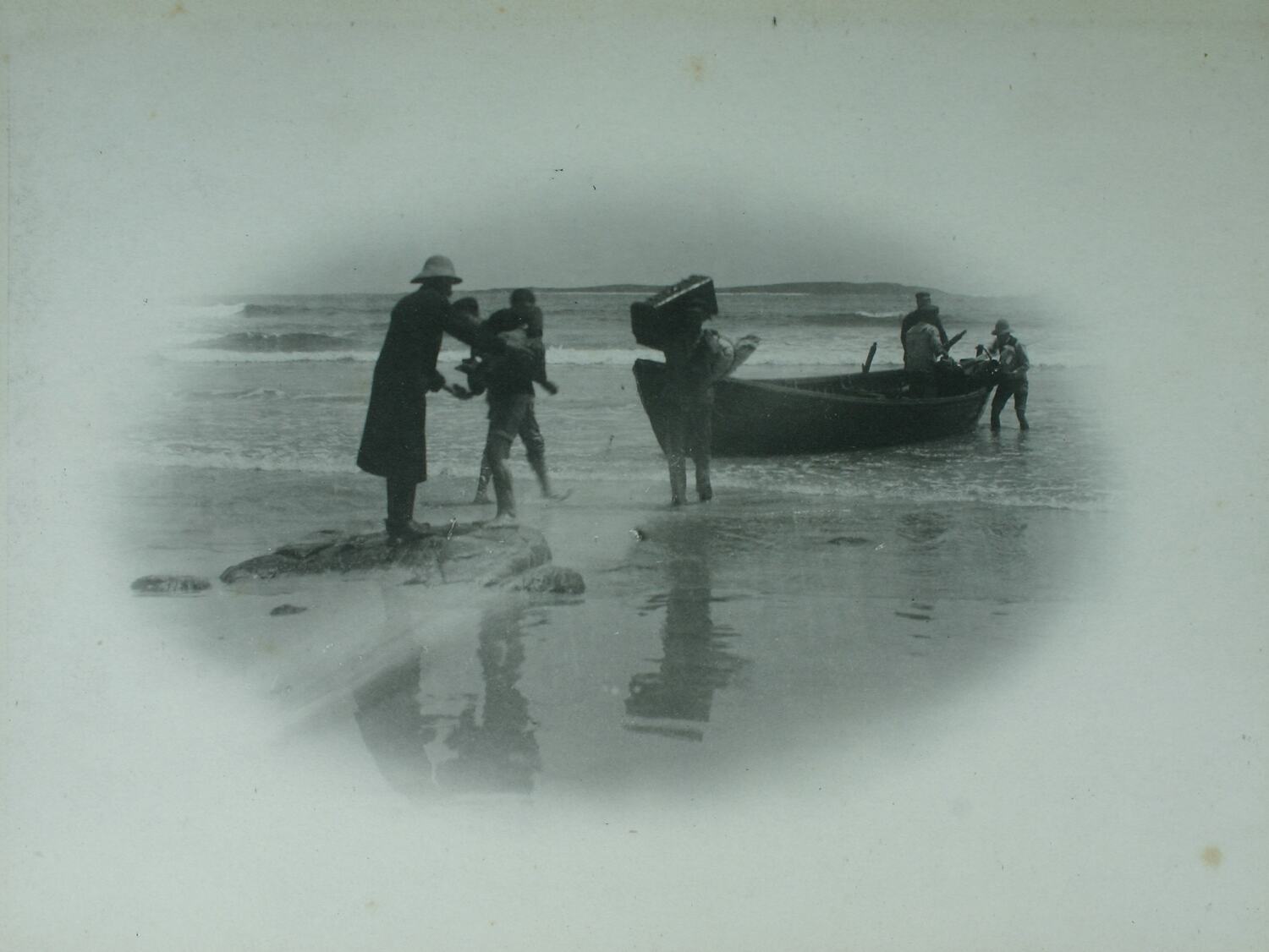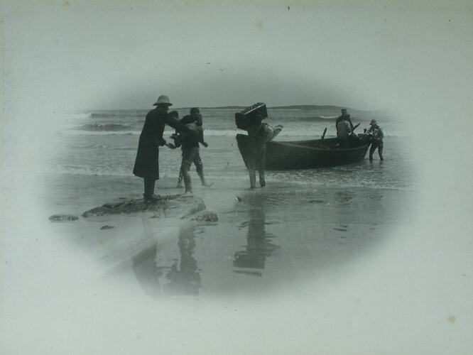 Members of the Field Naturalists Club of Victoria at King Island. The men are disembarking from a row boat at Yellow Rock Beach. Other men, possibly crewmen, are assisting with the unloading of luggage and packs. Photograph taken by Archibald J. Campbell, ornithologist and photographer, during a scientific expedition by the group to the island in November 1887.