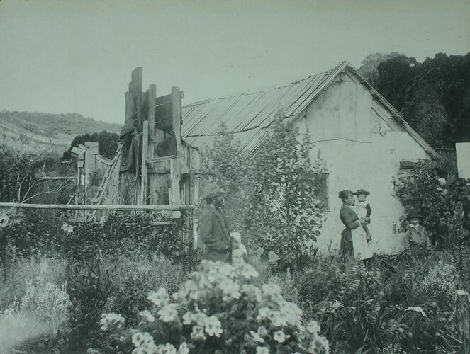 A wallaby hunter and his family in front of their dwelling on King Island. The woman is holding one of the two children in her arms. The house is made from materials salvaged from the wreckage of the ship Loch Leven which went aground on the northern tip of King Island in 1871. Photograph taken by Archibald J. Campbell during a Field Naturalists Club of Victoria scientific expedition to King Island in November 1887.