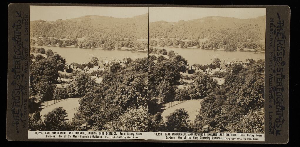Rose stereograph titled "Lake Windermere and Bowness, English Lake District. From Biskey House Gardens. One of the Many Charming Outlooks". Copyright 1910 by Geo. Rose. One in a series of 32 stereographs dating from the early 20th century.
