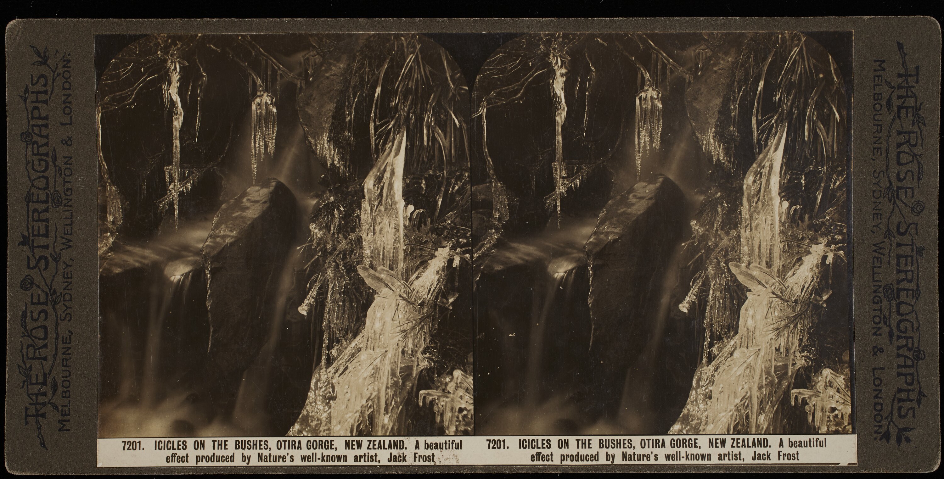 Rose stereograph titled "Icicles on the Bushes, Otira Gorge, New Zealand. A beautiful effest produced by Nature's well-known artist, Jack Frost". One in a series of 32 stereographs dating from the early 20th century.