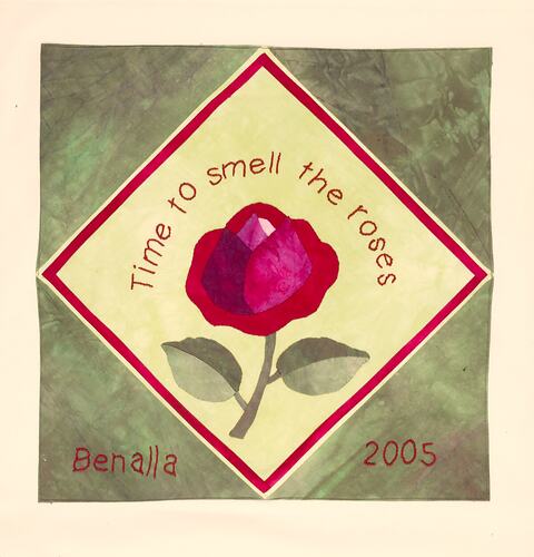 Patchwork square featuring a mottled green fabric background foregrounded with a central logo. This insert logo, which is square-diamond shaped, is light green, rimmed with a red border and features a hand-appliqued image of a red rose. Above the rose, the logo features embroidered red thread that reads, 'Time to smell the roses.' At the bottom of the patch, on the mottled green background, red text reads: 'Benalla 2005'.