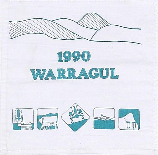 White cotton square featuring green printed mountains at the top, printed text reading '1990/WARRAGUL' in the centre and five printed icons at the base. The icons are square-shaped and depict various farming scenes - irrigation, cows, a tractor, fencing and milking machinery.