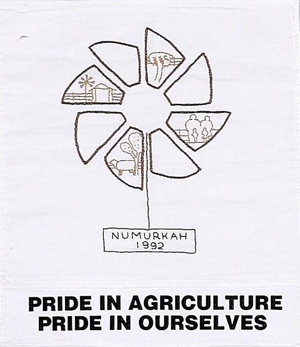 Square cotton patch featuring a central icon of an embroidered, dark brown windmill. The windmill contains eight blades, with four featuring symbols of farming enterprises. At the base of the windmil are the embroidered words, 'NUMURKAH/1992'. A separate cotton panel at base of the icon features black printed text that read: 'PRIDE IN AGRICULTURE/PRIDE IN OURSELVES'.