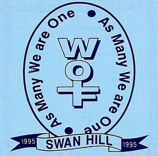 Light blue, square fabric patch featuring a dark blue, printed logo. The oval logo features the text: 'As Many We Are One: WOF.' Below this logo a printed ribbon reads: 'SWAN HILL/1995'. The printing has been applied in flock.