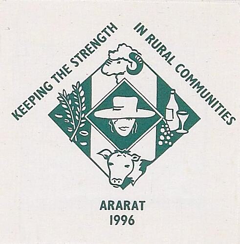Unbleached white fabric squarefeaturing a dark green logo in the centre of the patch. The printed logo, which is in the shape of a square diamond, includes an image of a woman's face, wheat, wine grapes, a cow and a sheep. Dark green text surrounds the logo and reads: 'KEEPING THE STRENGTH IN RURAL COMMUNITIES/ARARAT 1996'.