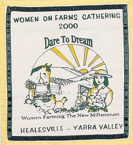 Square fabric bordered with yellow fabric and a green ribbon. The square white fabric patch features printed green text: 'WOMEN ON FARMS GATHERING/2000/Dare To Dream/Women Farming the New Millennium/HEALSVILLE-YARRA VALLEY'. The central logo, which is printed in shades of green and yellow, depicts a farmyard scene with a horse, chooks and a woman holding produce. Also featured on the printed logo is a rising sun, rolling hills and a computer.