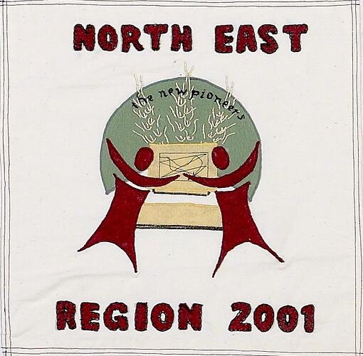 Square of unbleached calico with a machine appliqued central logo, featuring hand embroidery. The logo depicts two human silhouettes with their arms almost touching (in red), a computer screen and keyboard (in yellow) and a satellite dish (in green). Black text is embroidered in the green satellite dish and reads: 'the new pioneers'. Red lettering is applied with blanket stitch above and below the logo and reads: 'NORTH EAST/REGION 2001'.