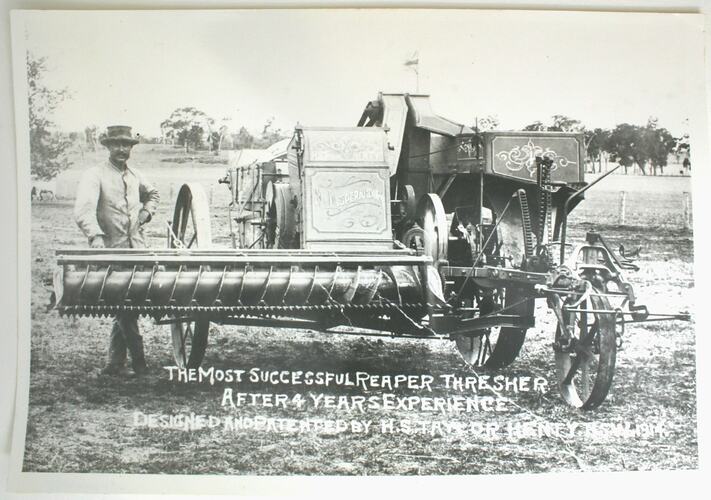 Text, hand printed on negative: 'The Most Successful Reaper Thresher After 4 Years Experience. Designed and Patented by H.S. Taylor Henty. N.S.W. 1914'.