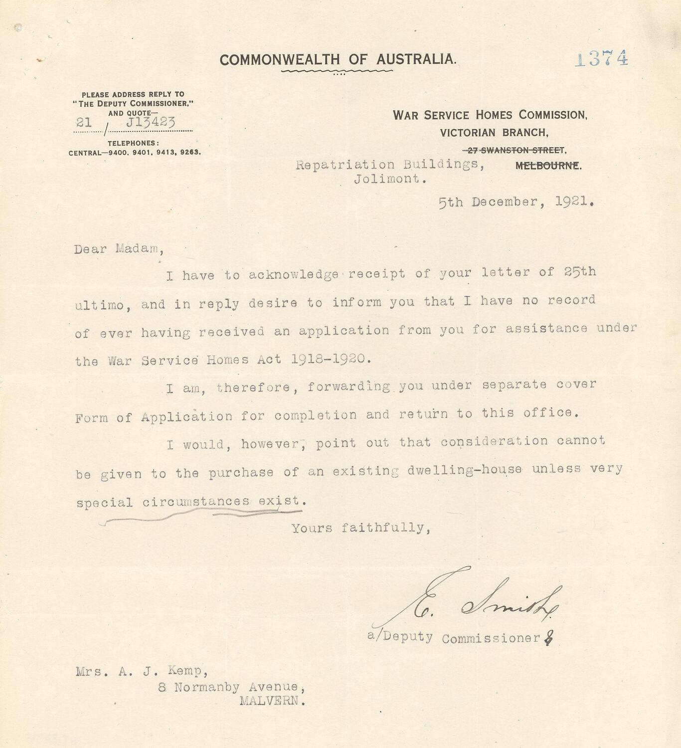 Typed letter from the War Service Homes Commission to Mrs Annie Kemp, widow of Pte Albert Edward Kemp, who was killed in action in 1917, during World War I. The letter explains that the Commission has no record of ever having received an application from her for assistance under the War Services Homes Act 1918-1920. The letter originally included a Form of Application for Annie to complete and return. The letter sternly points out that 'consideration cannot/be given to the purchase of an existing dwelling-house unless very special circumstances exist'.