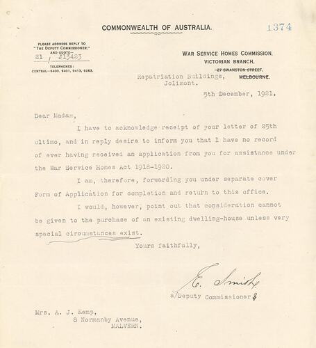 Text: COMMONWEALTH OF AUSTRALIA/WAR SERVICE HOMES COMMISSION/VICTORIAN BRANCH/Repatriation Buildings/Jolimont/5th December, 1921./Dear Madam,/I have to acknowledge receipt of your letter of 25th/ultimo, and in reply desire to inform you that I have no record/of ever having received an application from you for assistance under/the War Services Homes Act 1918-1920./I am, therefore, forwarding you under separate cover/Form of Application for completion and return to this office./I would, however, point out that consideration cannot/be given to the purchase of an existing dwelling-house unless very/special circumstances exist.