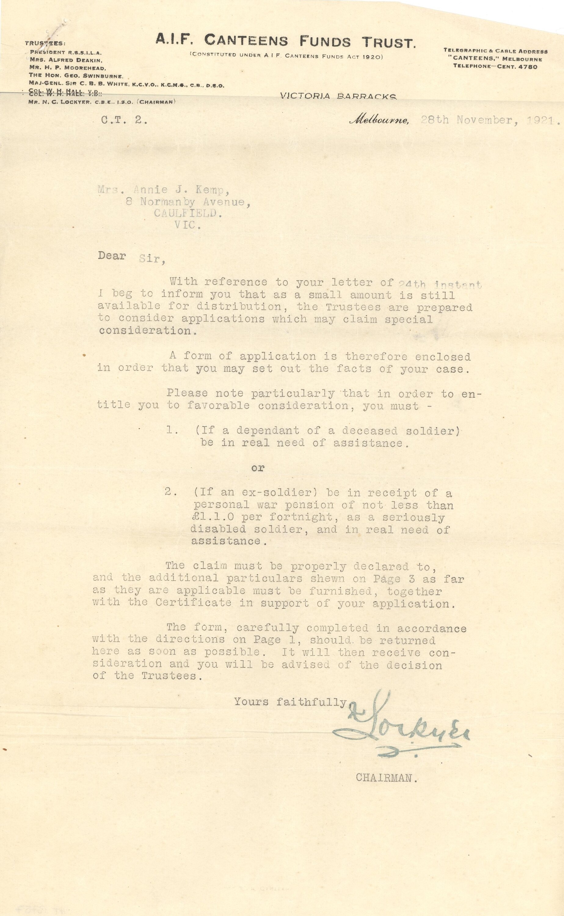 Single-page letter, typed onto letterhead. From the Canteens Funds Trust of the Australian Imperial Force to Annie Josephine Kemp, widow of soldier Private A.E. Kemp (who died on 21 September 1917 in Belgium). She has apparently written to request funds from the Canteens Funds Trust, and the letter in return originally enclosed a form for her to complete. The recepient had to be 'in real need of assistance'.