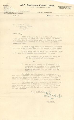 Text: A.I.F. CANTEENS FUNDS TRUST/VICTORIA BARRACKS/Melbourne, 28th November, 1921./Dear Sir/With reference to your letter of 24th instant/I beg to inform you that as a small amount is still/available for distribution, the Trustees are prepared/to consider applications which may claim special/consideration./A for of application is therefore enclosed/in order that you may set out the facts of your case.