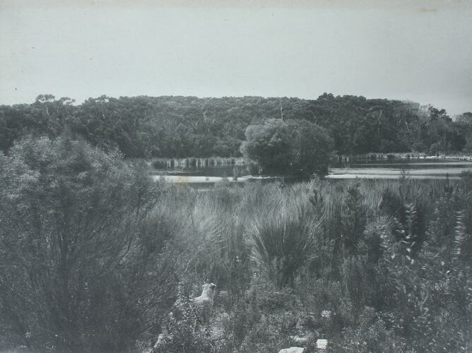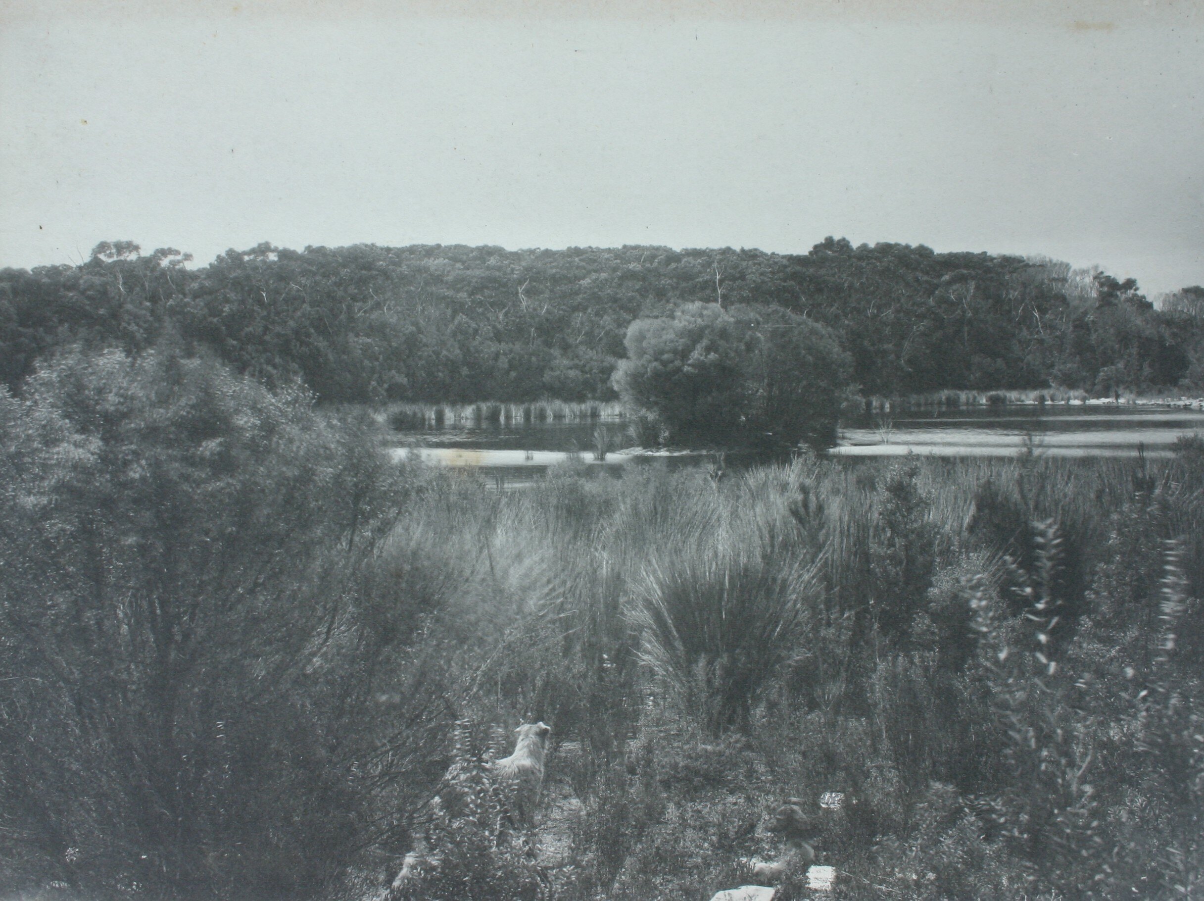 View of the Martha Lavinia Lagoon and surrounding bushland, King Island. In the foreground is a dog. Photograph taken by Archibald J. Campbell during a Field Naturalists Club of Victoria scientific expedition to King Island in November 1887.