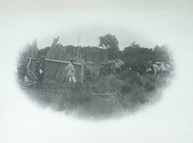 Members of the Field Naturalists Club of Victoria on a scientific expedition to King Island. The men and their packhorses are on the 'wallaby track'. Situated on the east coast of the island, the track was used by wallaby hunters. The men are setting off from 'Berti', a hunter's old campsite, remains of which are visible. Most of the men are carrying rifles. Photograph taken by Archibald J. Campbell, ornithologist and photographer, in November 1887.