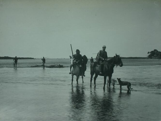 Members of the Field Naturalists Club of Victoria on a scientific expedition to King Island, November 1887. The men are fording the mouth of the Sea Elephant River on the east coast of the island. Three of the men, in the foreground, are on horseback (two on one horse and one the other). Three other men are standing behind them on the river bank. There are two dogs alongside the horses. Photograph taken by Archibald J. Campbell, ornithologist and photographer.