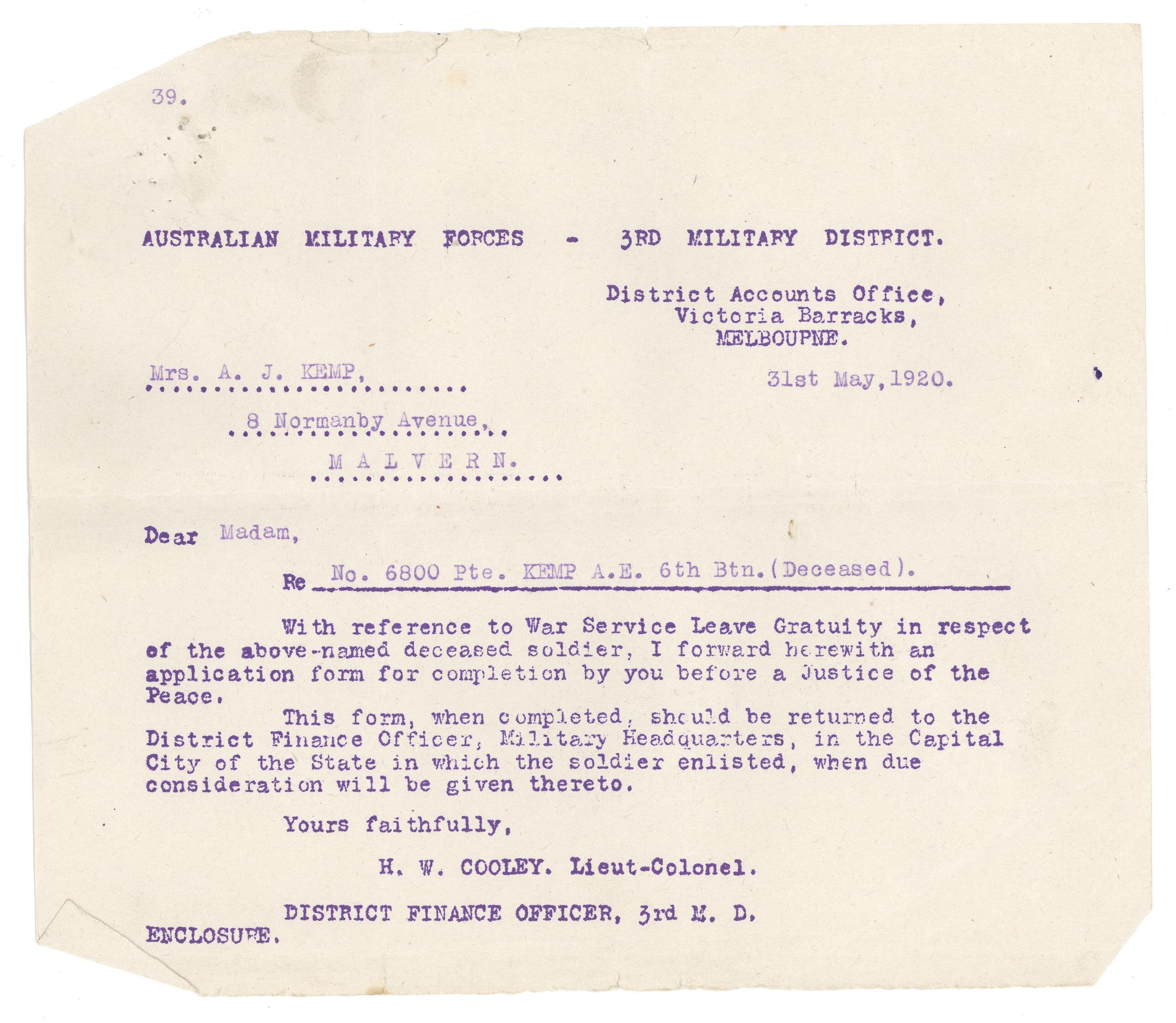 Text: AUSTRALIAN MILITARY FORCES - 3RD MILITARY DISTRICT/District Accounts Office/Victoria Barracks/MELBOURNE/31st May, 1920/Dear Madam/Re No. 6800 Pte. KEMP A.E. 6th Btn (Deceased)/With reference to War Service Leave Gratuity in respect/of the above-named deceased soldier, I forward herewith an/application form for completion by you before a Justice of the/Peace./This form when completed should be returned to the/District Finance Officer, Military Headquarters, in the Capital/City of the State in which the soldier enlisted, when due/consideration will be given thereto.