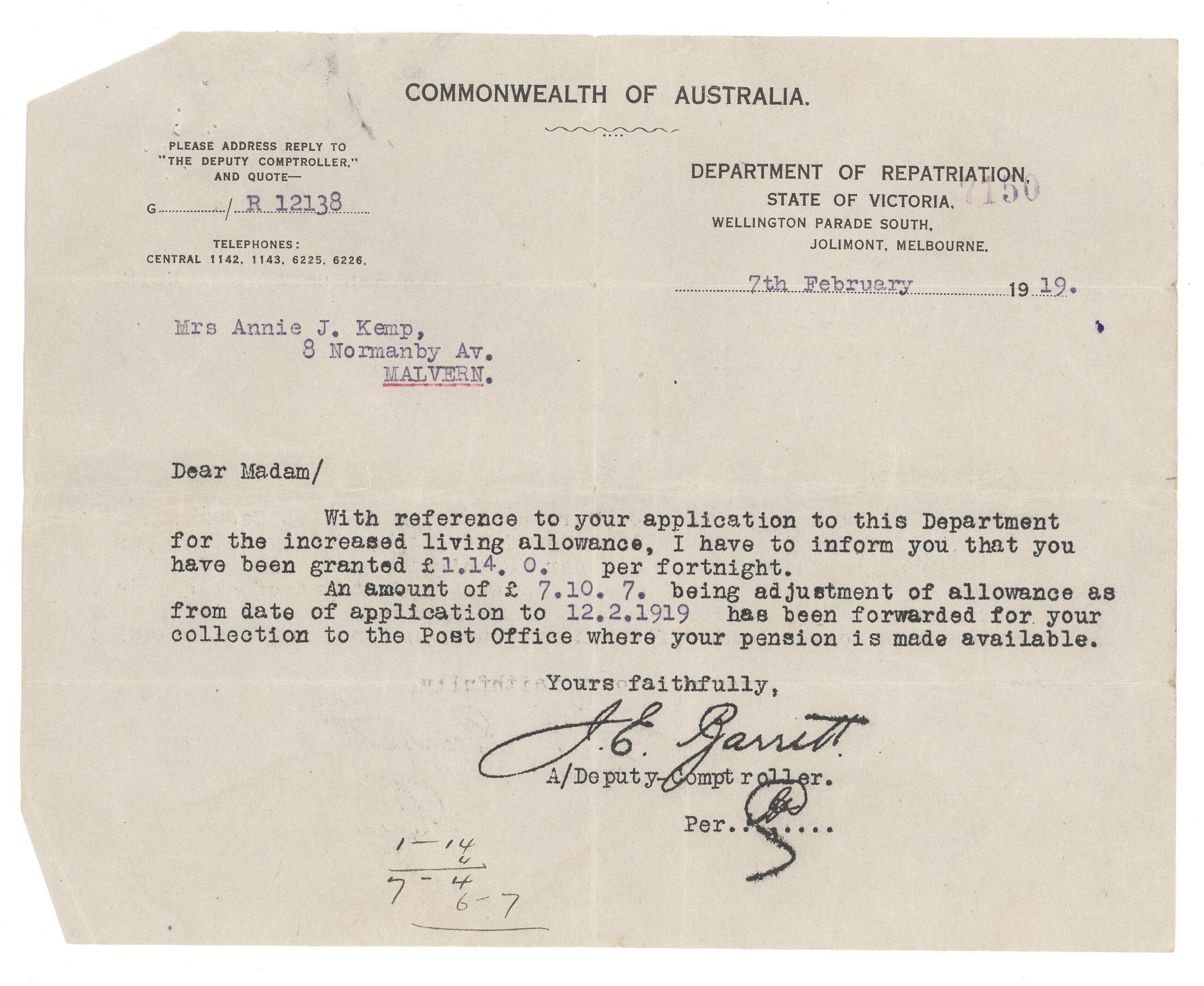 Text: COMMONWEALTH OF AUSTRALIA/DEPARTMENT OF REPATRIATION/STATE OF VICTORIA/WELLINGTON PARADE SOUTH/JOLIMONT, MELBOURNE/7th February 1919/Dear Madam/With reference to your application to this Department/for the increased living allowance, I have to inform you that you/have been granted £1.14.0. per fortnight./An amount of £7.10.7 being adjustment of allowance as/from date of application to 12.2.1919 has been forwarded for your/collection to the Post Office where your pension is made available.
