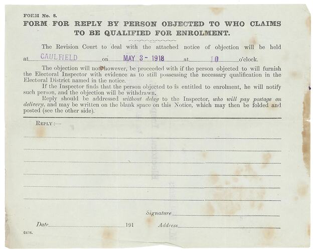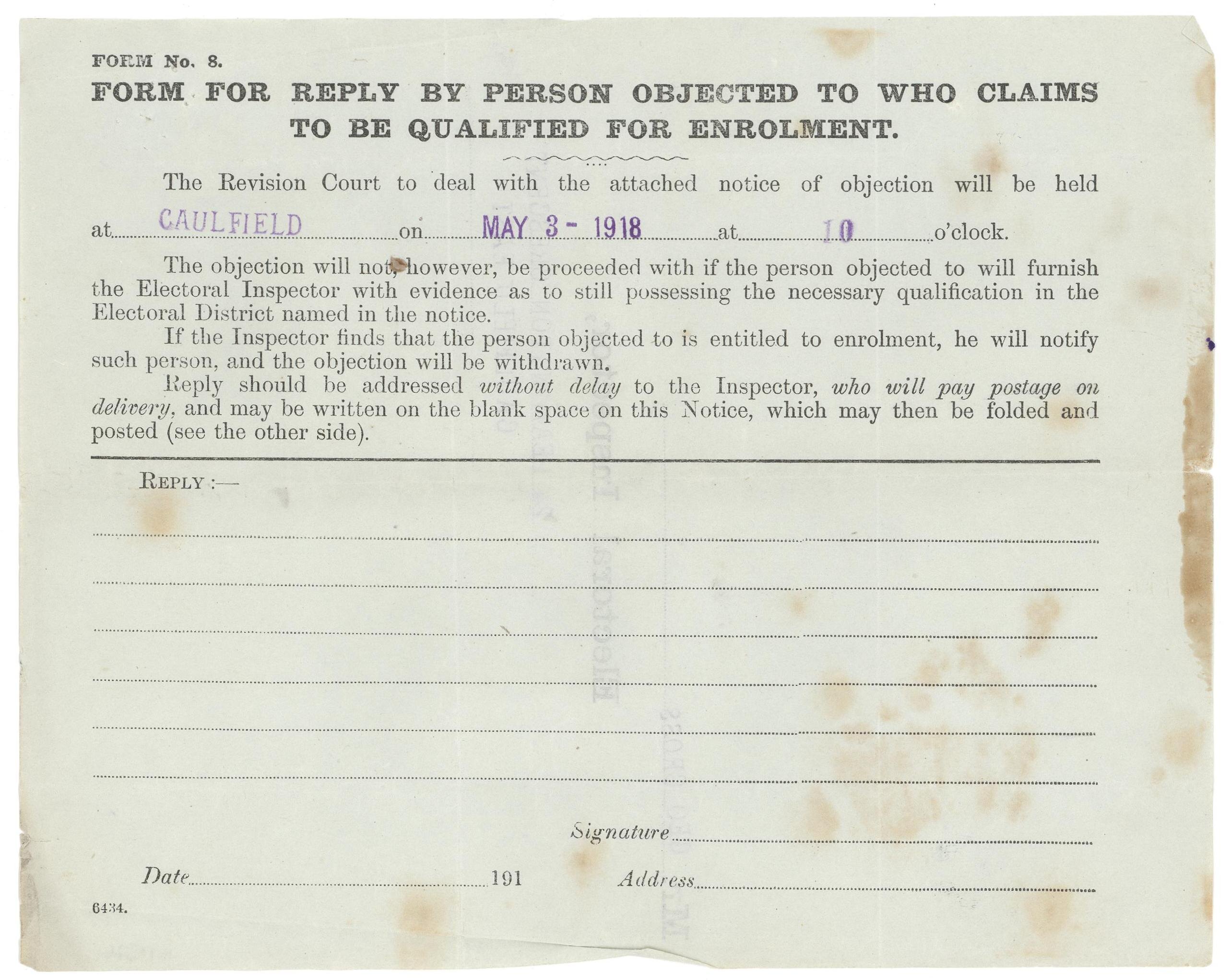 Text on front: 'FORM No. 8/FORM FOR REPLY BY PERSON OBJECTED TO WHO CLAIMS/TO BE QUALIFIED FOR ENROLMENT/The Revision Court to deal with the attached notice of objection will be held/at CAULFIELD on MAY 3 1918 at 10 o'clock/The objection will not, however be proceeded with if the person objected to will furnish/the Electoral Inspector with evidence as to still possessing the necessary qualification in the/Electoral District named in the notice.' Text of back: 'Mr. GEO CROSS / Electoral Inspector, / 124 LEAMINGTON CRESCENT / CAULFIELD EAST'.