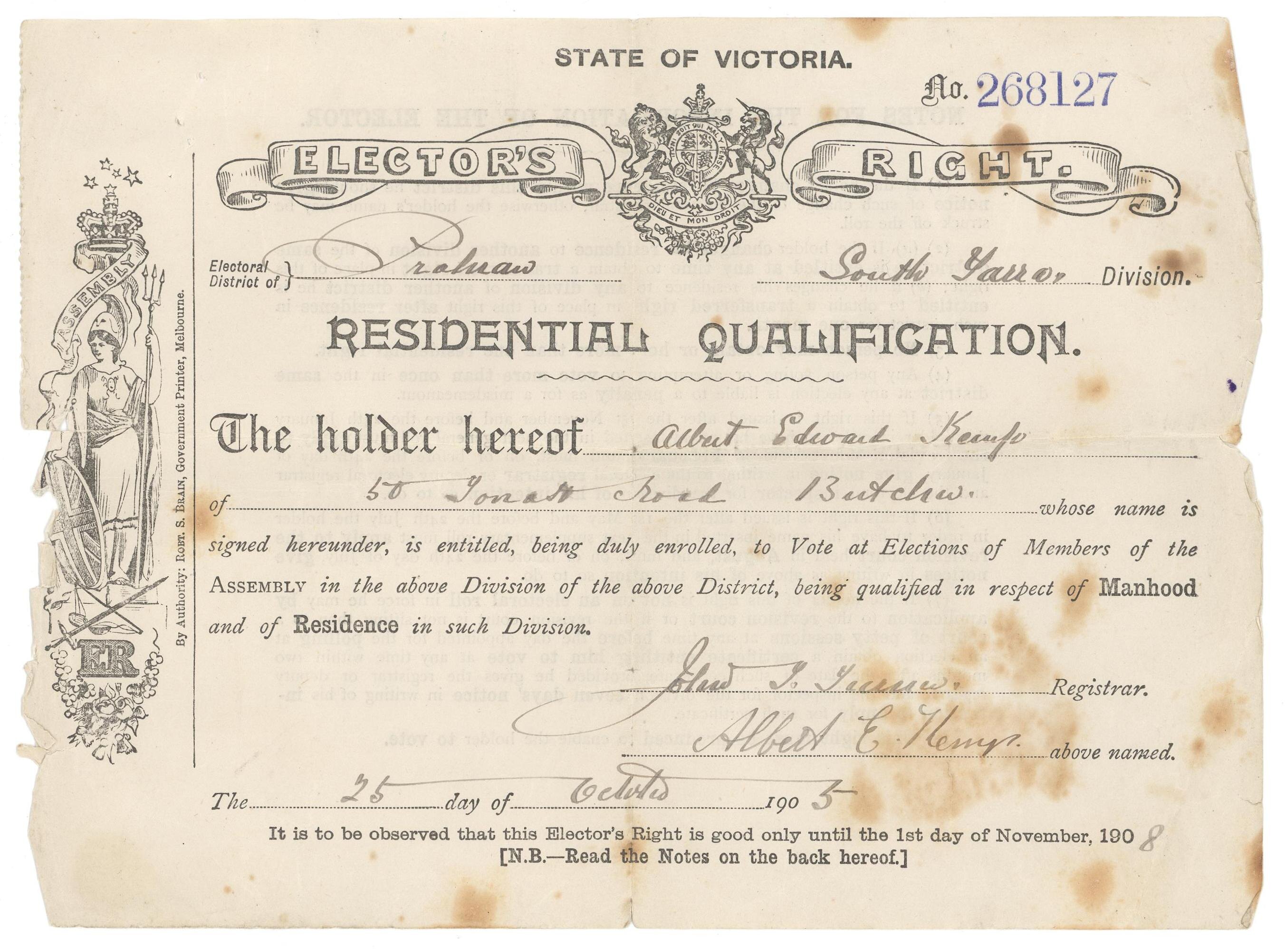 Text: STATE OF VICTORIA/No. 268127/ELECTOR'S RIGHT/Electoral/District of/Prahran/South Yarra Division/RESIDENTIAL QUALIFICATION/The holder herof Albert Edward Kemp/whose name is/signed hereunder, is entitled, being duly enrolled. to Vote at Elections of Members of the/ASSEMBLY in the above Division of the above District, being qualified in respect of Manhood/and of Residence in such Division.