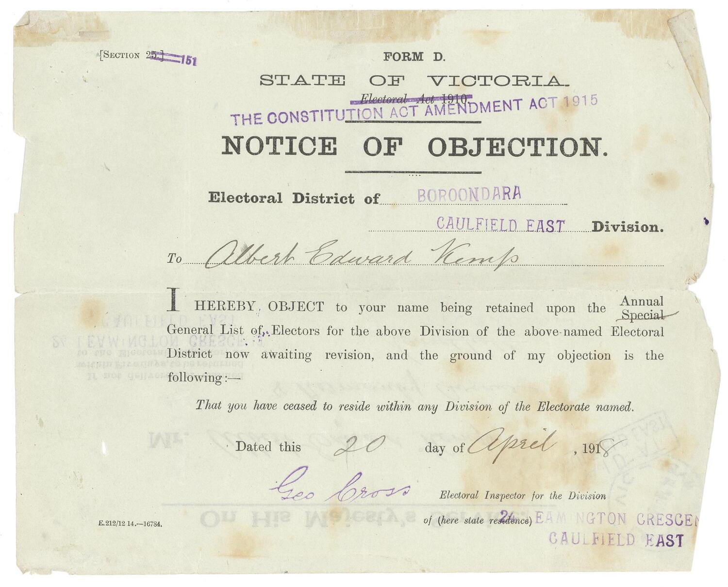 Text: FORM D./STATE OF VICTORIA/THE CONSTITUTION ACT AMENDMENT ACT 1915/NOTICE OF OBJECTION/Electoral District of BOOROONDARA/CAULFIELD EAST Division/To Albert Edward Kemp/I HEREBY OBJECT to your name being retained upon the Annual/General List of Electors for the above Division of the above-named Electoral/District now awaiting revision, and the ground of my objection is the/following:-/That you have ceased to reside within any Division of the Electorate named./Dated this 20 day of April 1918.