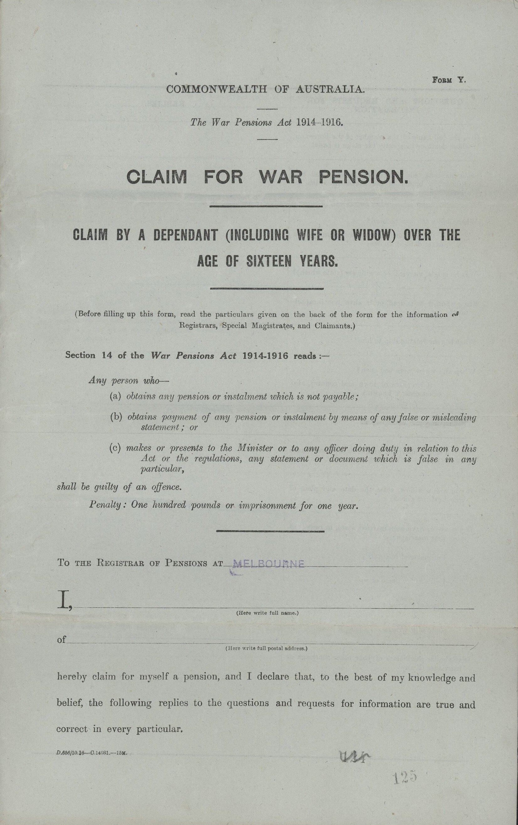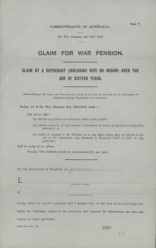 Grey form printed in black, of several pages. To be completed by a dependent (including a wife or widow) over the age of 16 who had been bereaved by war. It has been stamped 'Melbourne'. The form requests details of the 'member of the Forces on whose death or incapacity the claim is based', the dependant's relationship to that person, and the level of financial dependency on that person. The form ends with two pages of information 'For Registrars, Special Magistrates, and Claimants, covering 'Persons Entitled, and Rates Payable', 'How and When to Apply for Pension', 'Payment of Pensions' and 'How Long Pensions are Payable'. Widows lost their pensions two years after re-marriage. The form was issued under the War Pensions Act 1914-1916.