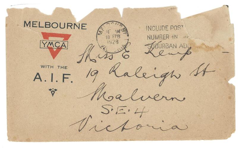 Text: MELBOURNE/YMCA/WITH THE/A.I.F./Miss E. Kemp/19 Raleigh St/Malvern/S.E.4/Victoria.