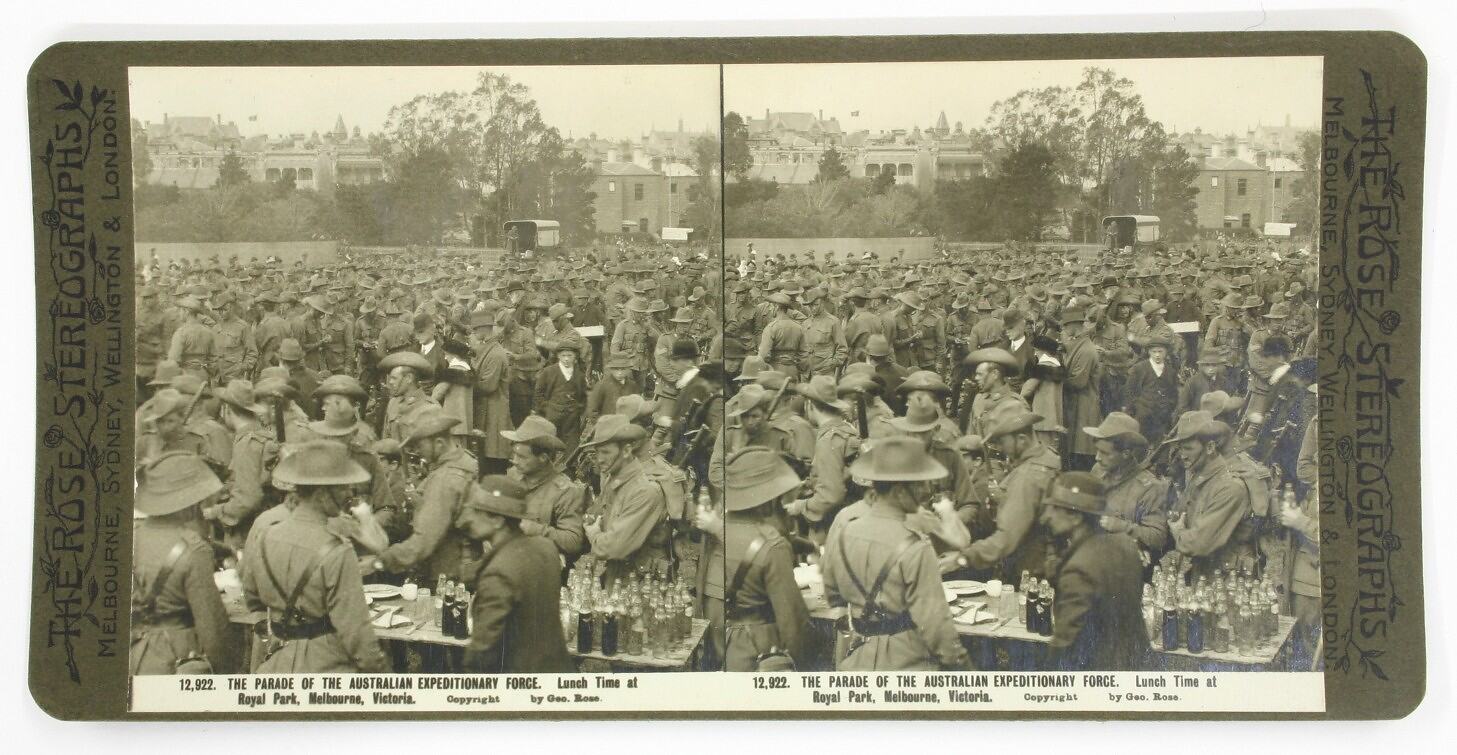 Rose stereograph titled 'The Parade of the Australian Expeditionary Force. Lunch Time at Royal Park, Melbourne, Victoria.' dated to the early 20th century. Depicts soldiers queuing for lunch at a table covered with glass bottles and food. Terrace houses, buildings and trees in the background. Housed in original box with a series of 31.
