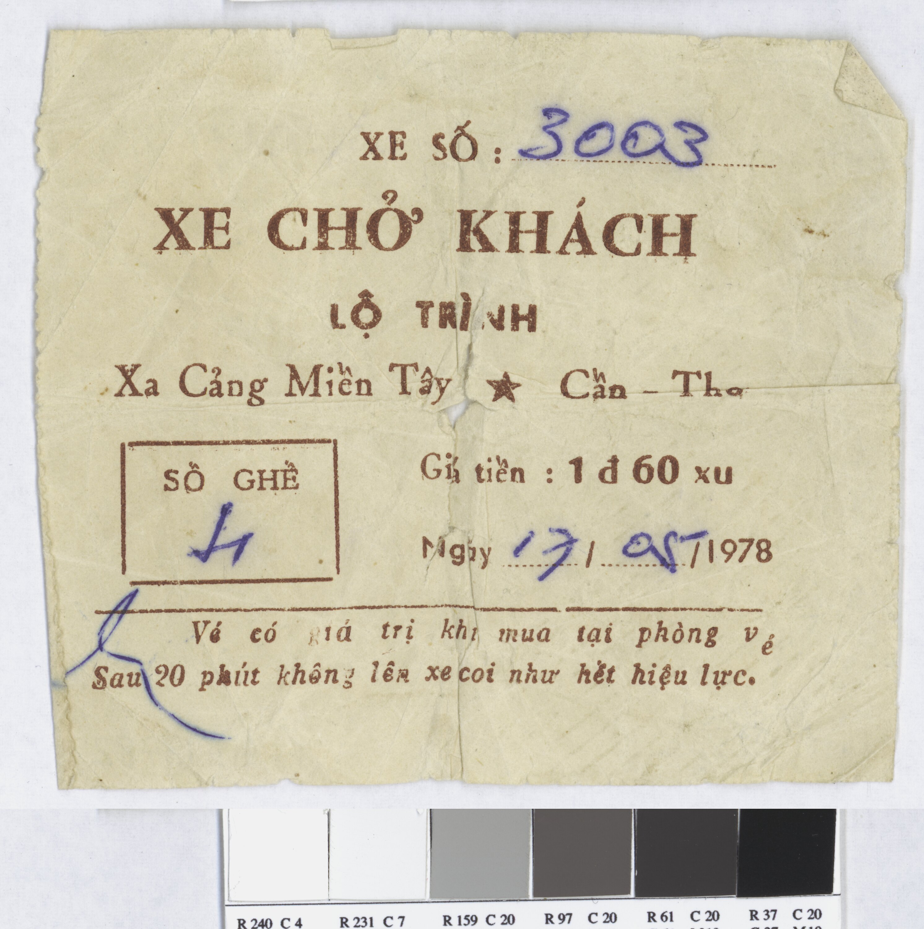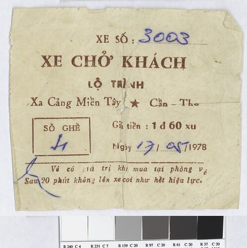 Bus ticket for Cuc Lam (Tran Thi Cuc), which she used on 17 March 1978 to travel from Saigon to Can Tho, where she escaped from Vietnam in a fishing boat. Her husband Lam Huu Minh, who escaped with her, was already at Can Tho. Cuc and her husband spent time in a refugee camp in Malaysia before being granted refugee status by the Australian Government.