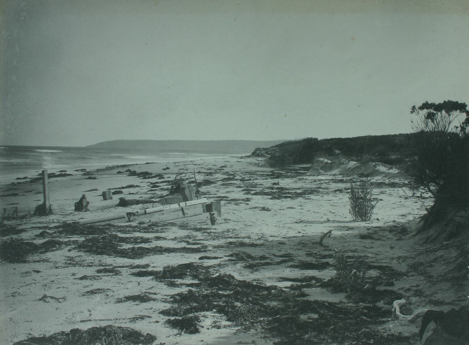 The remains of the Barque 'Altona' - which was sea wrecked in 1877 - on the foreshore at Sea Elephant Bay, King Island. In the distance is Point Campbell. Photograph taken by Archibald J. Campbell during a scientific expedition by the Field Naturalists Club of Victoria to the island in November 1887.
