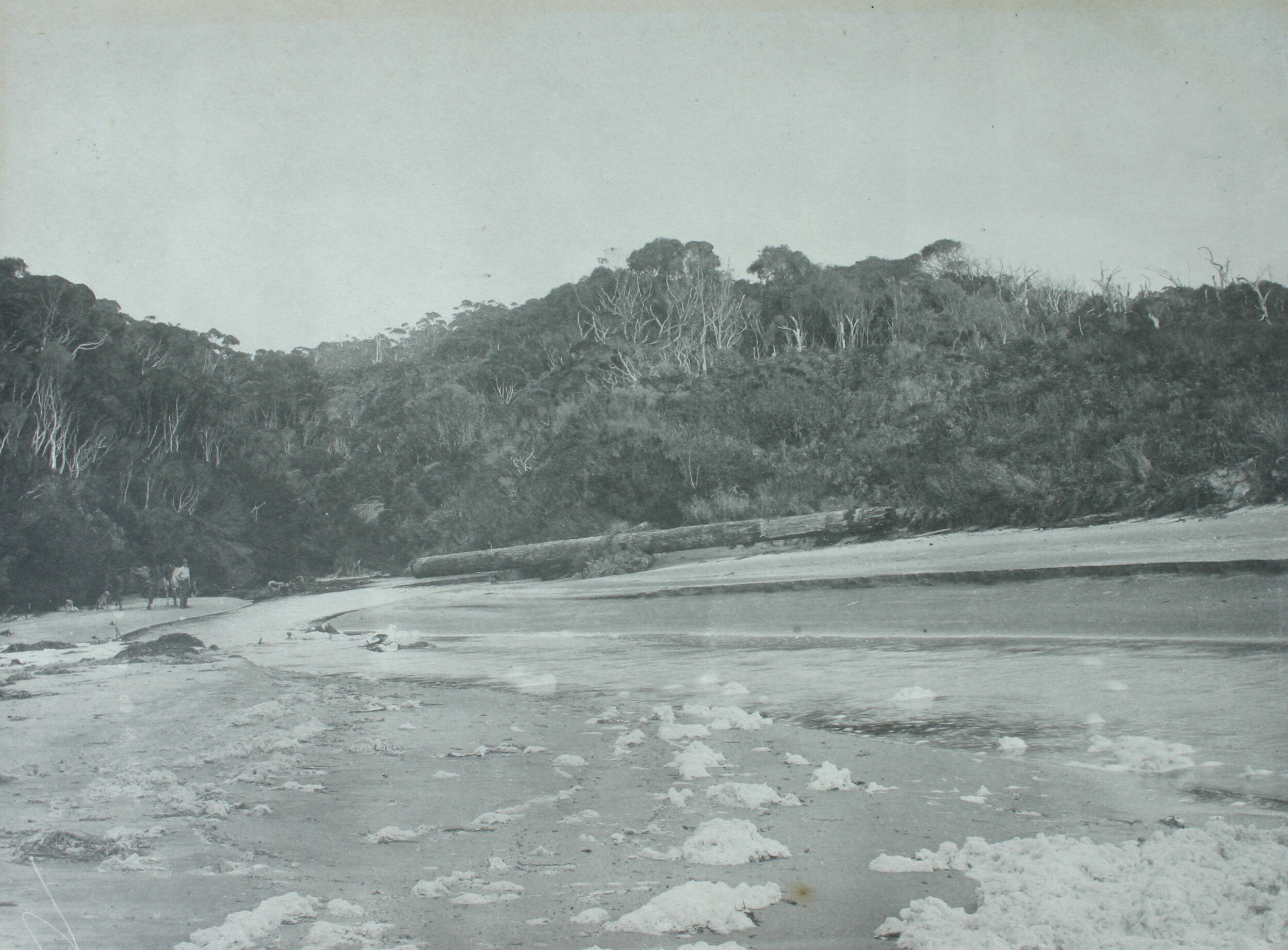 One of thirty-two black and white photographs in an album [two are loose] taken by A J Campbell during a Field Naturalists' Club of Victoria expedition to King Island in November 1887. The album also includes maps of King Island in the inside front cover and back page and numerous newspaper clippings relating to the expedition. One of the newspaper clippings, written by one of the members of the party, documents the mission of the expedition thus: 'It is our intention, before the introduction of numerous foreign plants and animals rendered it impossible to do so, to ascertain as precisely as we could in the short time at our disposal the fauna and flora indigenous to the island.'