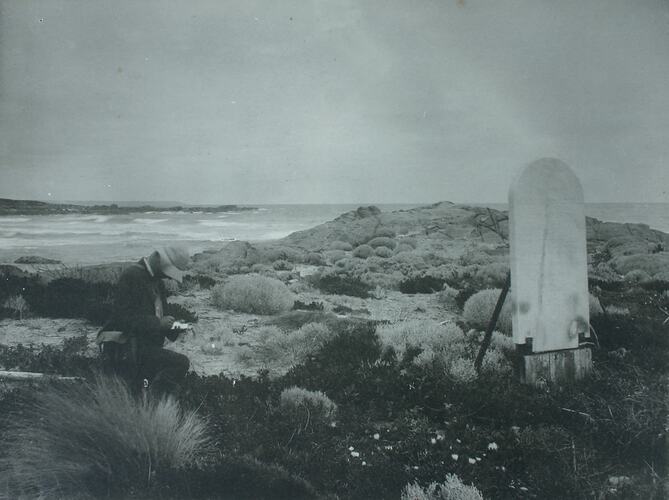 Marble headstone erected on the foreshore on King Island to the memory of Wm. Dazell Nicholson ,'Tilly' Dale and others who perished near this site in the wreck of the ship British Admiral on 23rd May 1874. Photograph taken by Archibald J. Campbell during a scientific expedition by the Field Naturalists Club of Victoria to the island in November 1887. A man, probably a member of the expedition, is taking notes [transcribing the epitaph] near the headstone.