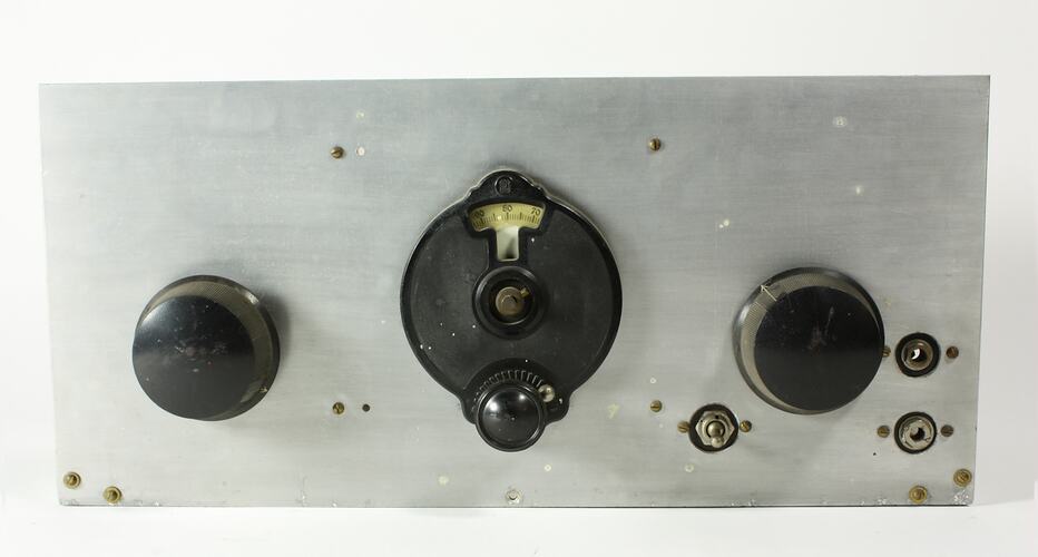 A four valve radio receiver, home-made, mounted on a metal support.
