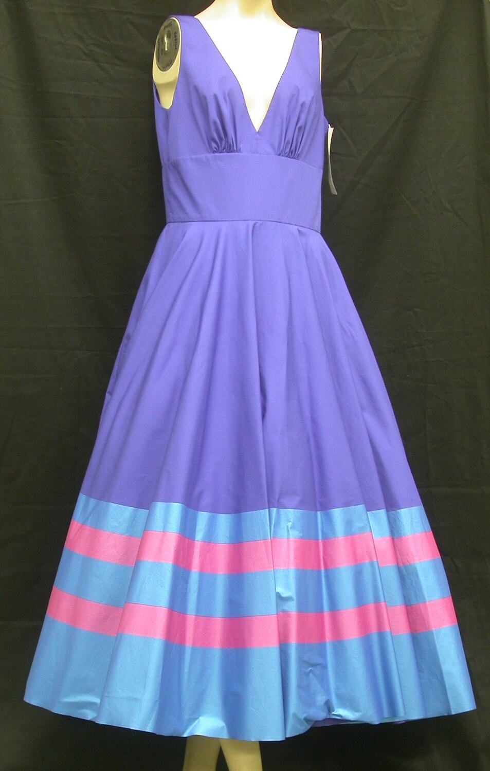Mid-blue dress with printed band of three light blue stripes, separated by two pink stripes at hem. Two-layer tule petticoat beneath skirt.