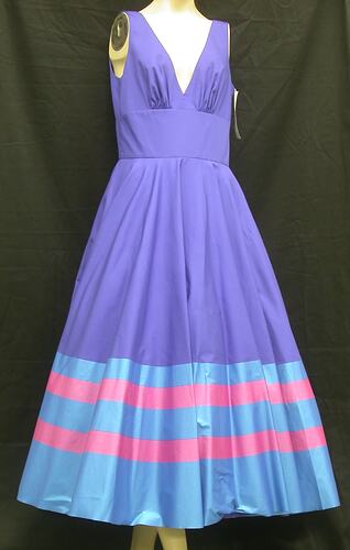 Mid-blue dress with printed band of light blue and pink at hem. It is one of five designs for the Placard Bearers who led the teams around the Melbourne Cricket Ground during the Athlete's Parade segment of the Opening Ceremony of the Melbourne 2006 Commonwealth Games. This dress was made by the Costume workshop of the Melbourne 2006 Commonwealth Games Ceremonies team. The colour band designates this dress as being for the Asia region. Although this costume was not worn during the ceremony, it is identical to those that were worn.