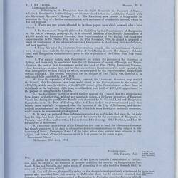 Document tabled in the Parliament of Victoria in 1852 entitled 'Immigration'. The document includes reports from the commissioners of Emigration in London, regarding the desire to stimulate immigration to Victoria and New South Wales via designated funds - noting that the discovery of gold in both colonies had yet to make a notable impact on numbers immigrating. It also sets out regulations for emigrants selection and a sample migrant application form, with the stated aim of attracting agricultural workers who would not be tempted by gold finds; as well as Scottish Highland landlords willing to send emigrants such as shepherds; and the possibility of encouraging boatloads of German immigrants. Interestingly, the Colonial Land and Emigration Office are concerned about maintaining immigrant numbers, as well as a dependence on government funds for assisted emigration.