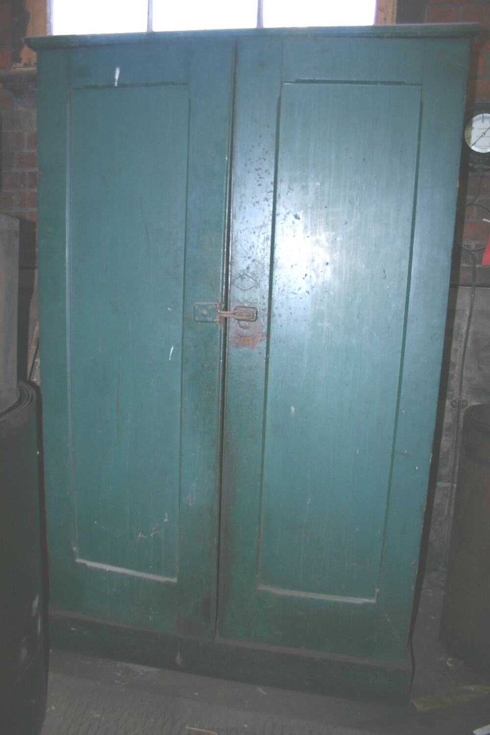 Green painted wooden cupboard for secure storage of tools. Found in the South Engine Room. Tagged SER E2-1.