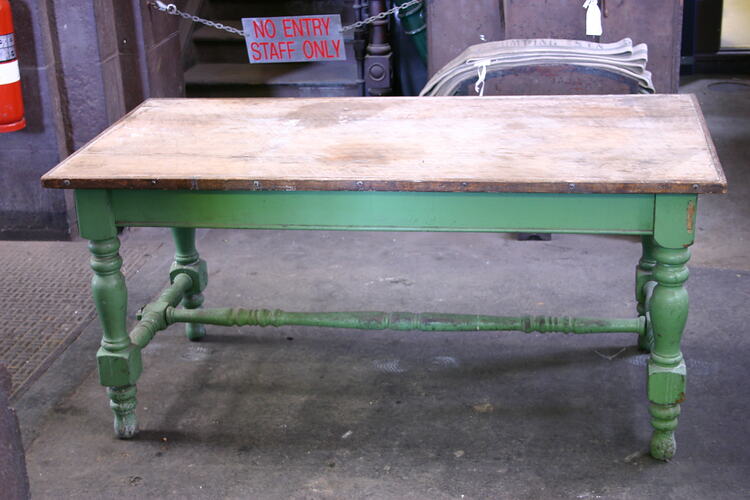 Wooden table, with 5-ft 6.1/4-inch x 2-ft 8.3/4-inch top, measuring 2-ft 7.1/3-inch high, with four turned wooden legs and turned wooden supports. Painted light green. Original description: Wooden table, measuring 5-ft x 3-ft.