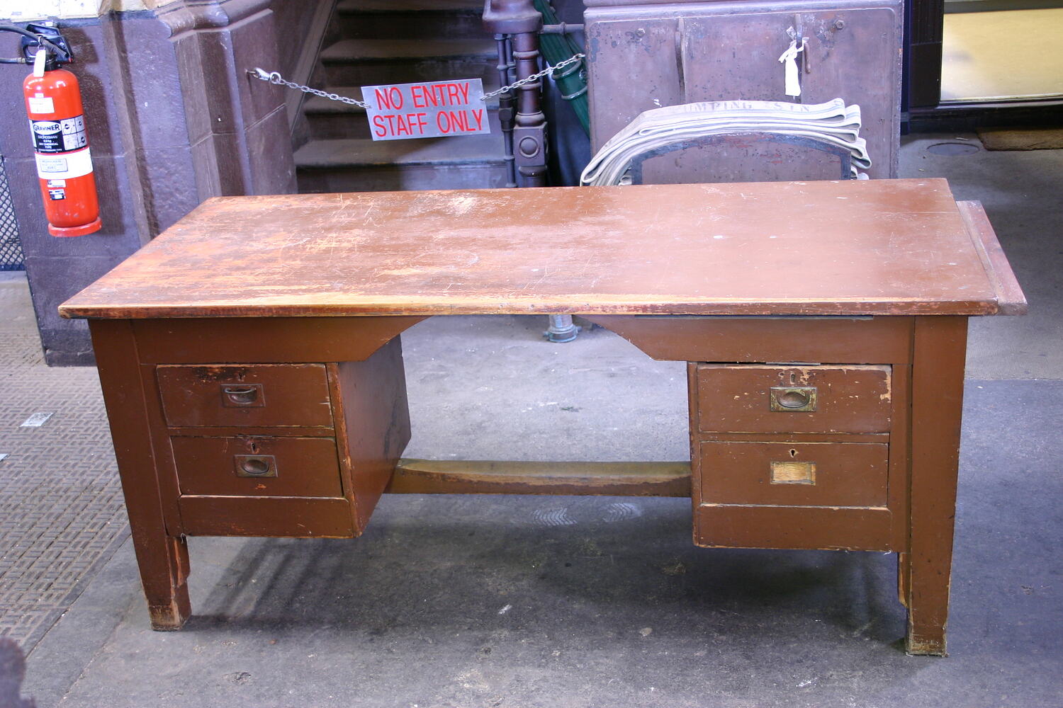 Wooden office desk with four drawers. Located in the clerk's office of the the former MMBW Spotswood Sewerage Pumping Station. This office may have originally been used by the Station superintendent.